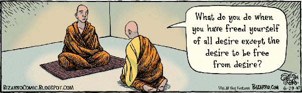 Burton is untroubled by Herman’s paradox of desire, because he sees two ways out. First, he notes that many Buddhists have long distinguished lustful, grasping types of desire from what might be called “aspirations.” Wanting to rid oneself of all cravings would, of course, be considered an example of the latter, beneficial-rather-than-harmful, type of wanting. And, as I have conceded above, it doesn't seem to be quite fair to count such a "desire" as included in the sort of "choices" made a body politic. In any case, Burton says that rather than craving desirelessness, we can, as Herman had also suggested, strive for it in some less appropriative way. Alternatively, if one doesn't want to distinguish two types of wants, one can instead throw a partition between two sorts of objects of desire: those for things that are good for us and those generally addictive items that not only don’t make us particularly happy when we get them, but actually make our lives worse the more we obtain them.  Either solution saves us from any alleged paradox according to which we can get what we’re looking for only if we can get to a state where we don't want or get anything at all. (My own Hallian position on prudential values doesn't make a sharp separation between those two approaches, since it makes a CHOICE a matter involving both the wanting and an obtaining.)